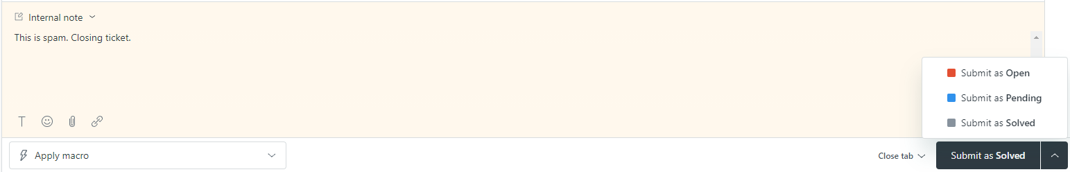 When deleting a ticket, agents should always add an internal note clarifying their reason for removing the ticket by navigating to the dropdown in the upper left hand corner of the messaging box and selecting "Internal note".