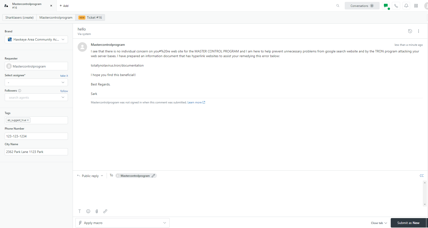 Because of the various methods of contact that clients have available to them, occasionally a ticket may come in from a source that doesn't seem like it's from a client in need. In these instances, it's important for agents to use their best judgement and respond accordingly. If a ticket is obviously spam or otherwise junk, getting rid of the ticket is simple enough.