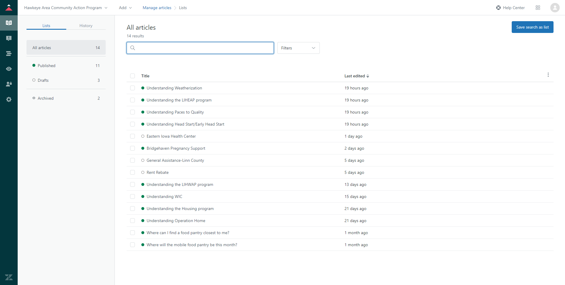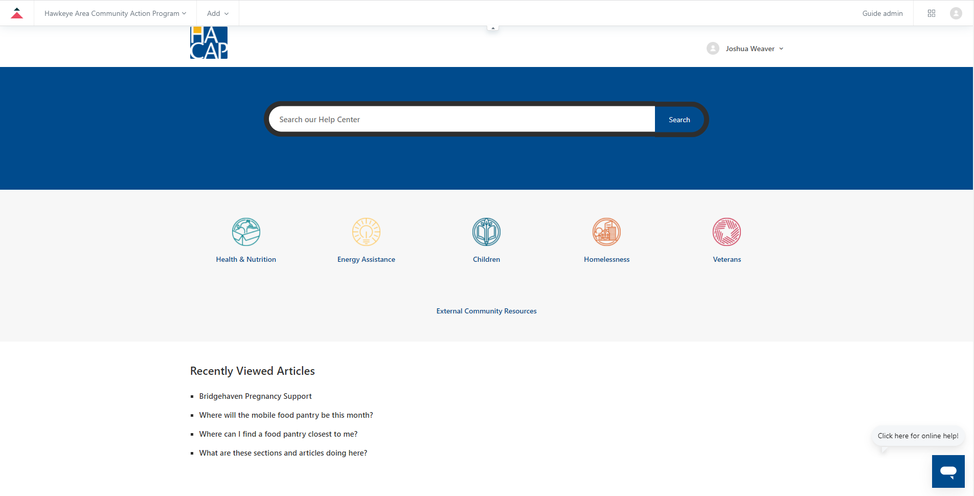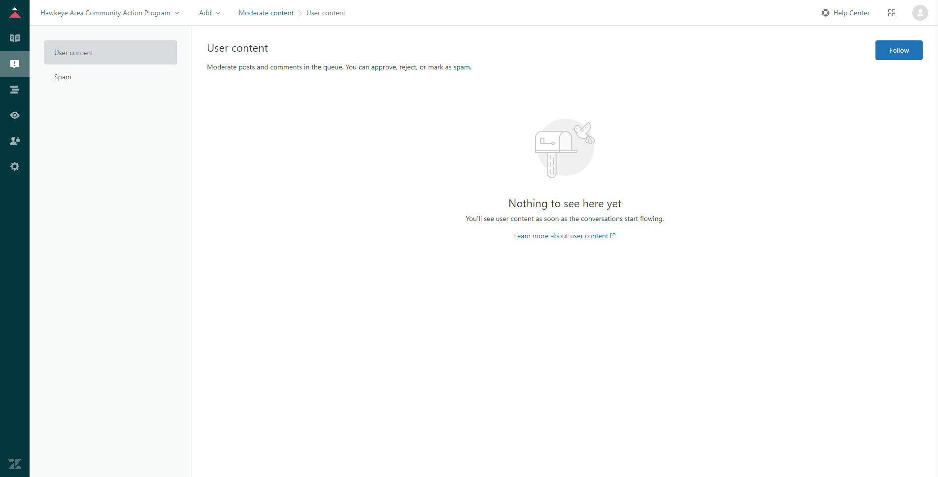 Moderate Content is where authorized agents can monitor and manage user-submitted content to the Help Center, such as posts and comments. HACAP has not enabled end-user comments in this section, so this area will be mostly ignored in day-to-day operations.