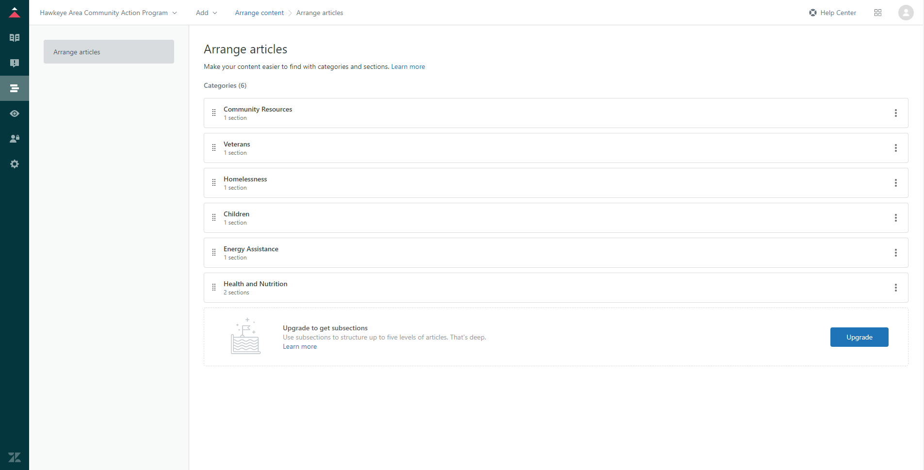 The Arrange Articles sections allows agents to manage in what order categories, sections and articles are displayed. While the main Help Center screen is specially designed to be unalterable by anyone other than a core admin, this area can be used to change which articles are shown first in other article pages.