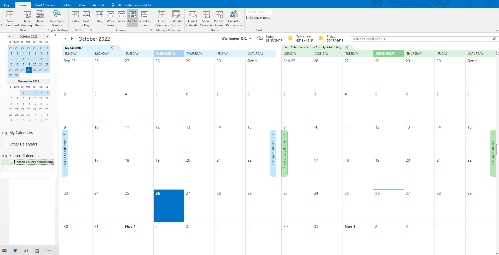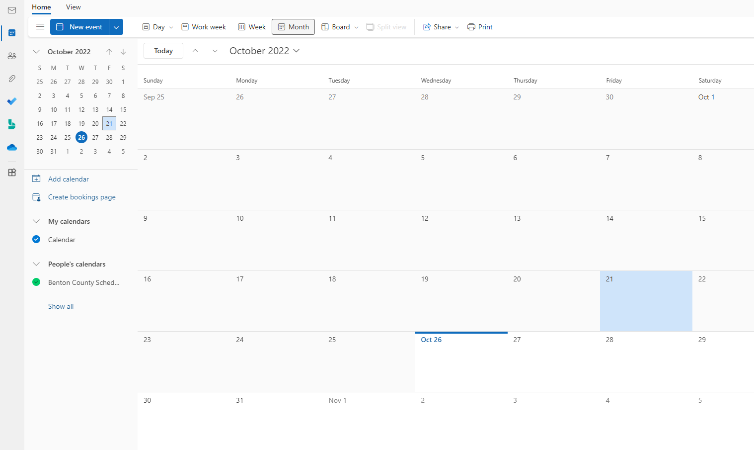 This will bring up your Outlook calendars. By default, only your own personal calendar will be shown, so you will have to click on the shared calendar to see it. If the calendar is not immediately visible, click on Shared Calendars (desktop app) or Peoples Calendars (web app) in the left hand section to bring up the full list of calendars.